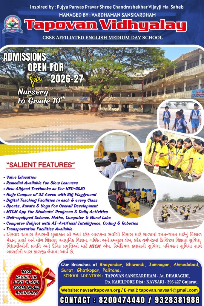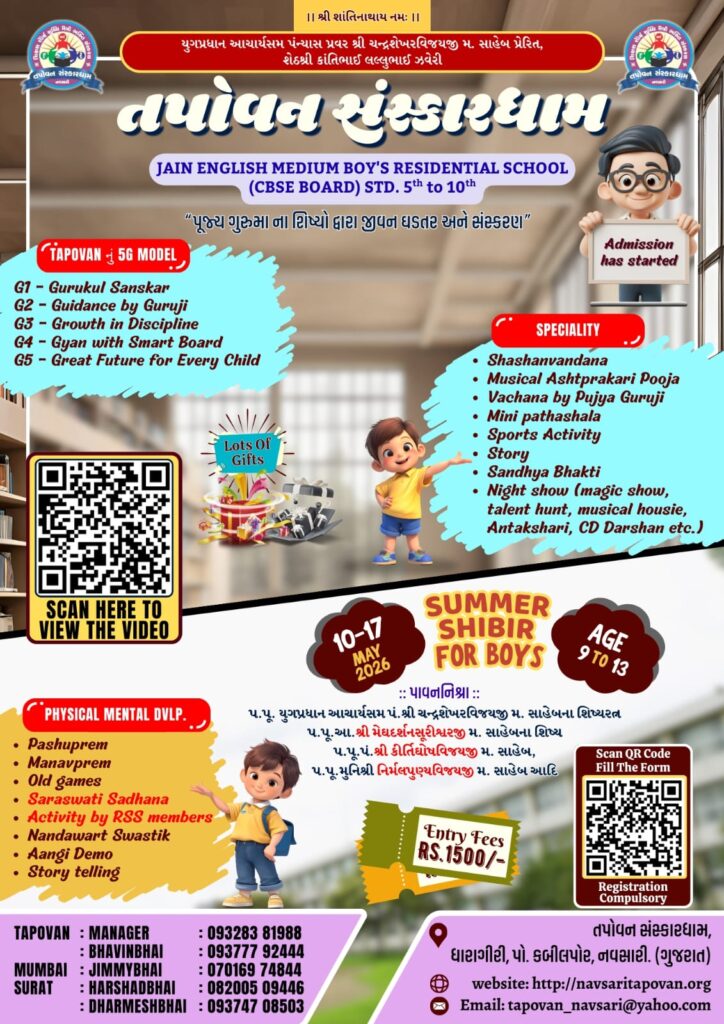 Tapovan Sanskardham is a residential English medium CBSE affiliated school for boys, established in Navsari (Gujarat) by Vardhaman Sanskriti Dham under the divine inspiration of His Holiness Yug Pradhan Acharya Sum Param Pujya Panyas Shri Chandrashekhar Vijayji Ma Sa.